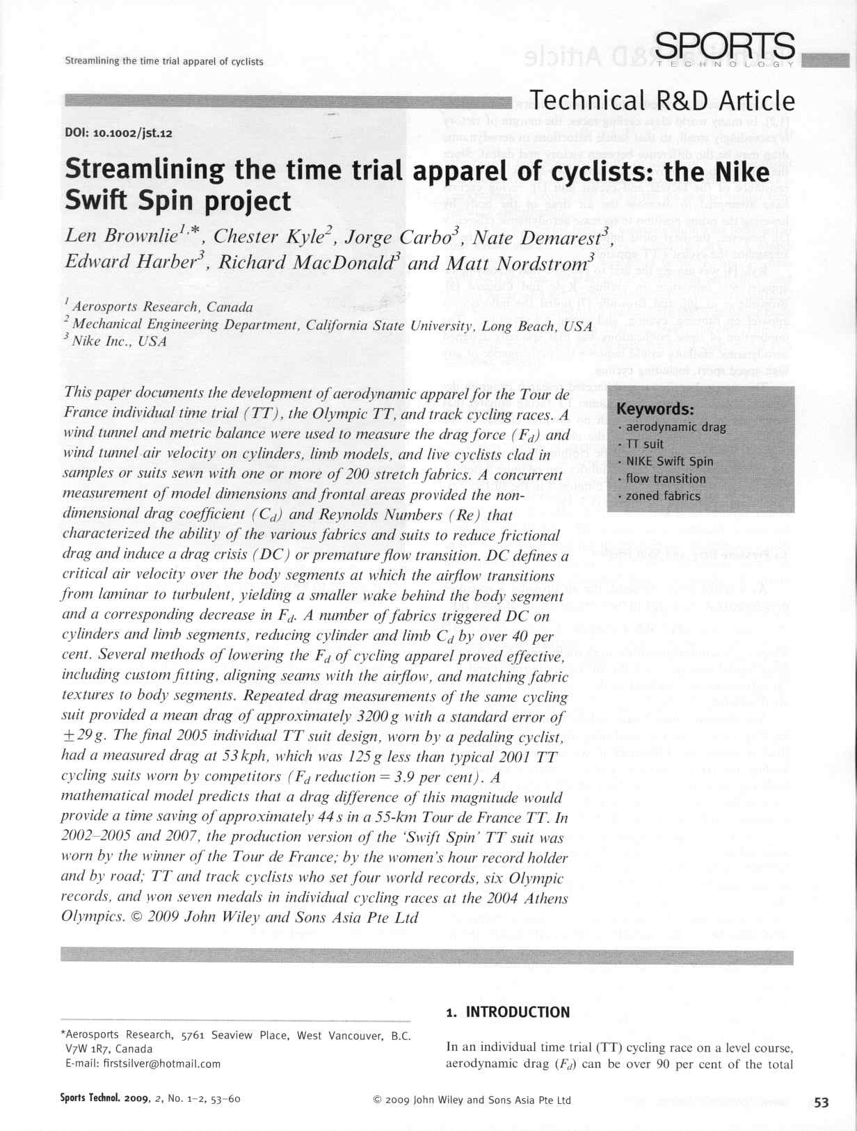- Streamlining the time trial apparel of cyclists: the Nike Swift Spin project (JPEG, 170 KB) Len Brownlie, Chester Kyle, Jorge Carbo, Nate Demarest, Edward Harber, Richard MacDonald and Matt Nordstrom Sports Technology (2009) 2, No. 1-2, 53-60.